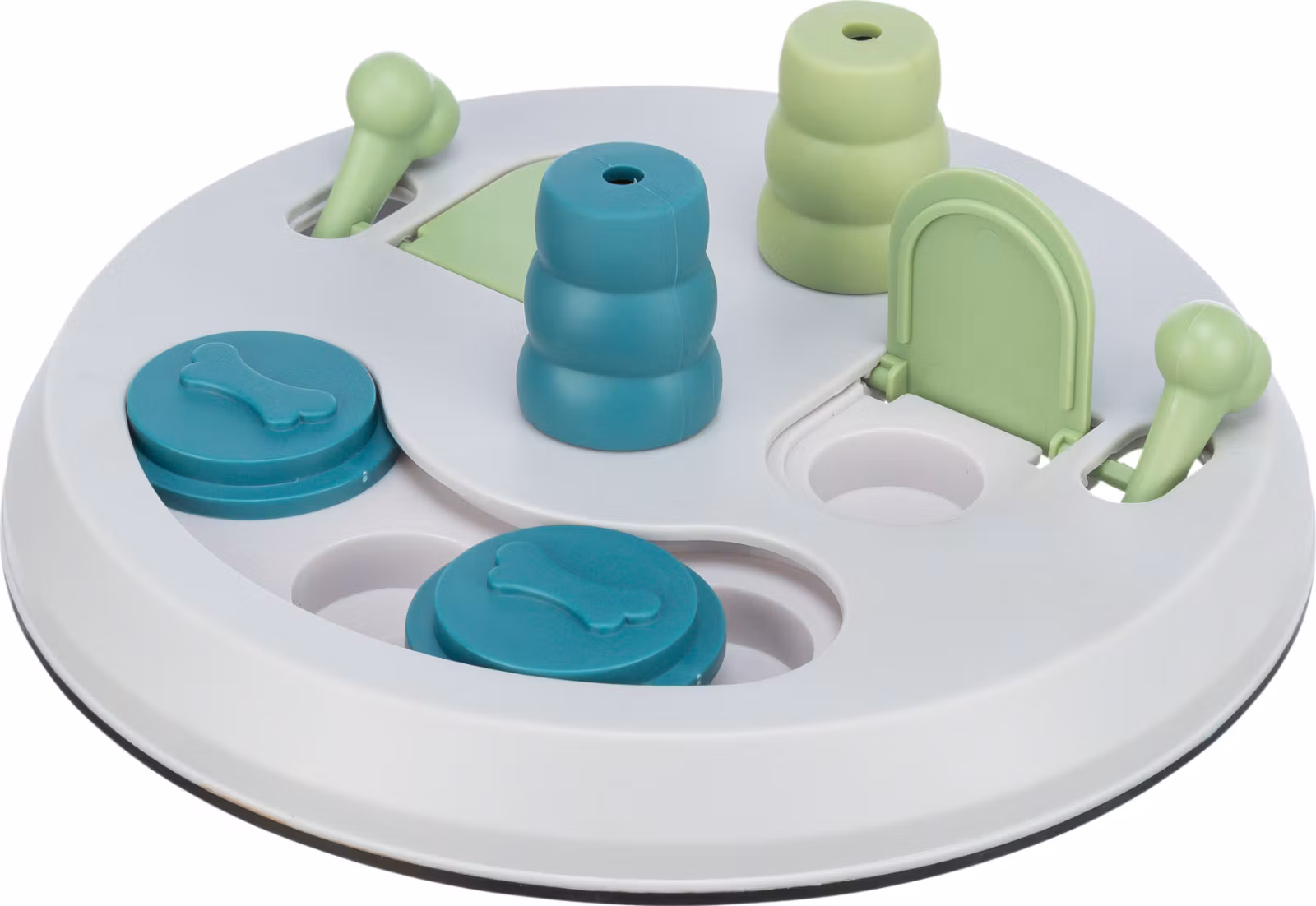 Flip Board nivå 2 är ett roligt intelligensspel för små hundar som älskar att nosa, klura och få belöning. Fyll fördjupningarna med godis och låt din hund peta upp locken, skjuta delarna och lista ut vägen till belöningen. De 2 konerna i mitten ger extra spänning – hunden behöver välta dem med tass eller nos för att komma åt snacksen.