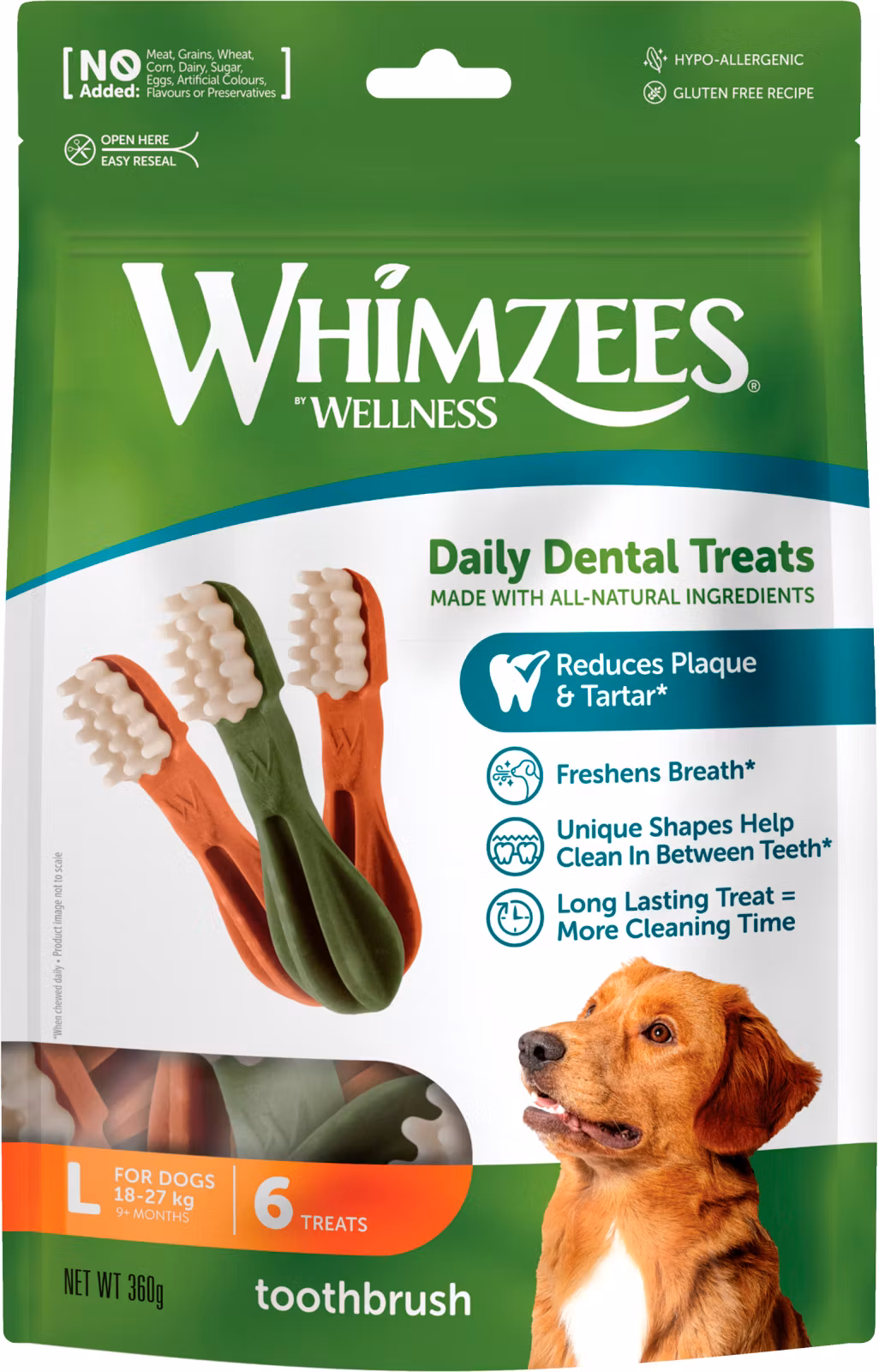 Whimzees Tandborste Large 6-packNjutbara och hälsosamma tuggbenDe underhållande och effektiva tandborstgodbitarna består av bara sex viktiga ingredienser och hj
